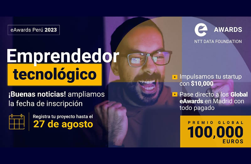 Lima, 14 de agosto de 2023.- ¿Tienes un proyecto tecnológico y estás buscando financiamiento? Dada la gran acogida, la Fundación NTT DATA anunció la ampliación de la convocatoria de sus Global eAwards 2023, que premiará el mejor emprendimiento tecnológico con 10 mil dólares en Perú, un programa de aceleración, y el pase directo a competir por un premio de 100 mil euros en la edición global que se llevará a cabo en Madrid, donde viajará con todos los gastos pagados.
