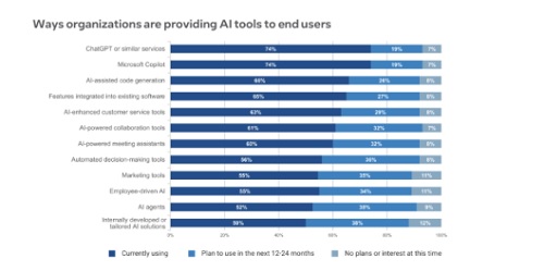 "Barras apiladas que muestran el porcentaje de organizaciones que ya usan, planean usar o no planean usar diversas herramientas de IA